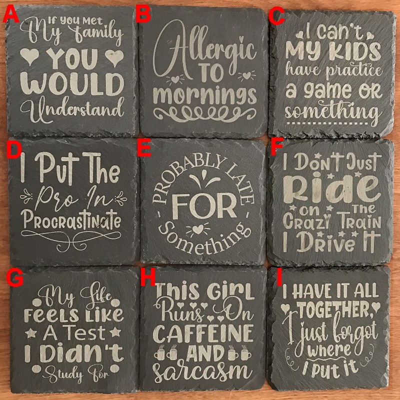 or a Great Gift Idea!Choose One or More Funny / Humorous Quotes on 4 x 4 inch Slate Coasters with Rubber Pads1. Select a Quantity (4, 6