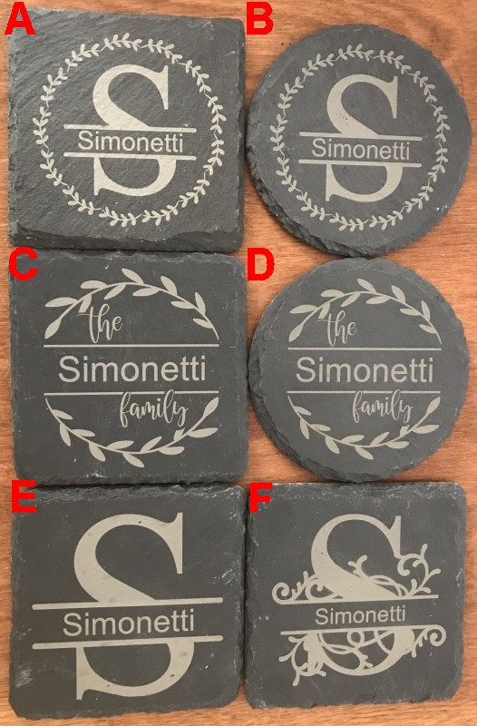 Custom Monogram Slate CoastersYour Last Name, in a Graphic Design on Square or Round Slate Coasters4 x 4 inch Slate Coasters with Rubber Pads